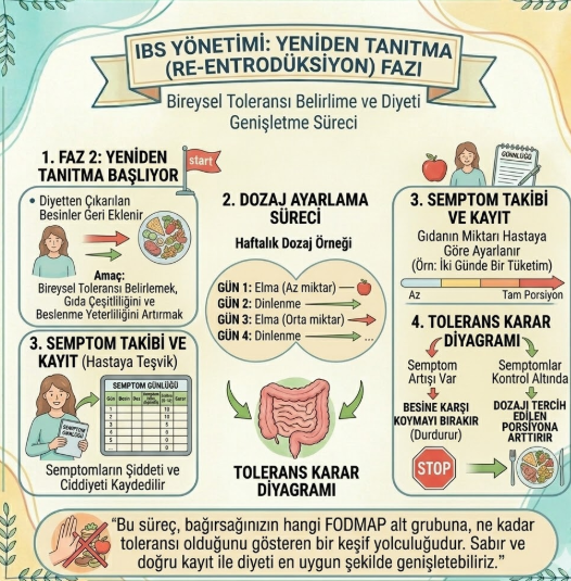 Semptomlar azaldığında, çıkardığımız besinleri tek tek geri ekliyoruz. Ancak bu işlemi kontrollü yapıyoruz. Hangi besin grubunun (örneğin fruktoz veya laktoz) sizi rahatsız ettiğini bu aşamada saptıyoruz.